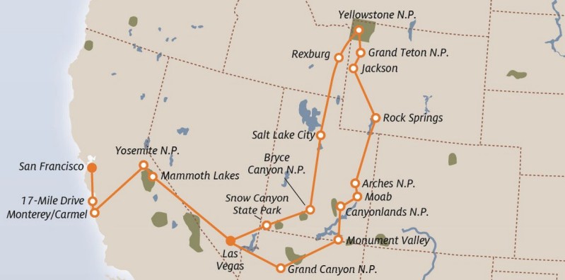 LAS VEGAS - GRAN CAÑÓN - CANYONLANDS - ARCHES - GRAN TETON - YELLOWSTONE - SALT LAKE CITY - BRYCE CANYON - SNOW CANYON- YOSEMITE - CARMEL - 17-MILE DRIVE - MONTEREY - SAN FRANCISCO